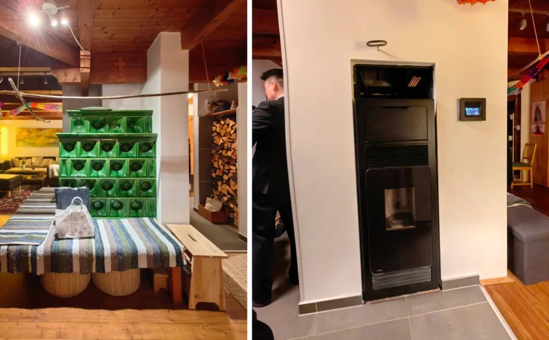 傍晚時分,受世界生物質(zhì)能源協(xié)會主席Christian Rakos先生邀請,前往他家做客(位于奧地利格拉茨郊區(qū)農(nóng)村),參觀了他家的生物質(zhì)供暖系統(tǒng),主席夫人在小院燃起篝火,準(zhǔn)備了豐盛的晚餐熱情招待了代表團。主席家的房子屬于典型的傳統(tǒng)木結(jié)構(gòu)民居,保溫性較好,供暖系統(tǒng)是房子中心的一堵供暖墻,圍繞供暖墻,既保留了傳統(tǒng)的自砌燃木壁爐(取暖靠陶瓷裝飾的墻壁輻射散熱,類似中國北方火墻),又安裝了新型顆粒壁爐,兩套取暖系統(tǒng)都在使用,家里干凈、暖和又溫馨。當(dāng)?shù)卣畬︵l(xiāng)村取暖污染物排放沒有任何限制要求。